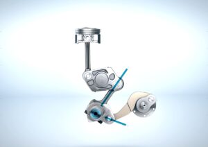 The once-simple engine piston gets sophisticated bottom-end internals, with a multi-link connector at the crankshaft that connects with another control shaft then an actuator arm and an electric motor-controlled rotating unit called the Harmonic Drive.