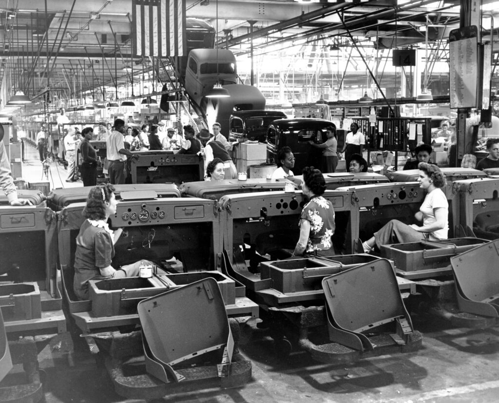 This image shows the interior of the Chrysler Group Truck Assembly Plant in the 1940s.